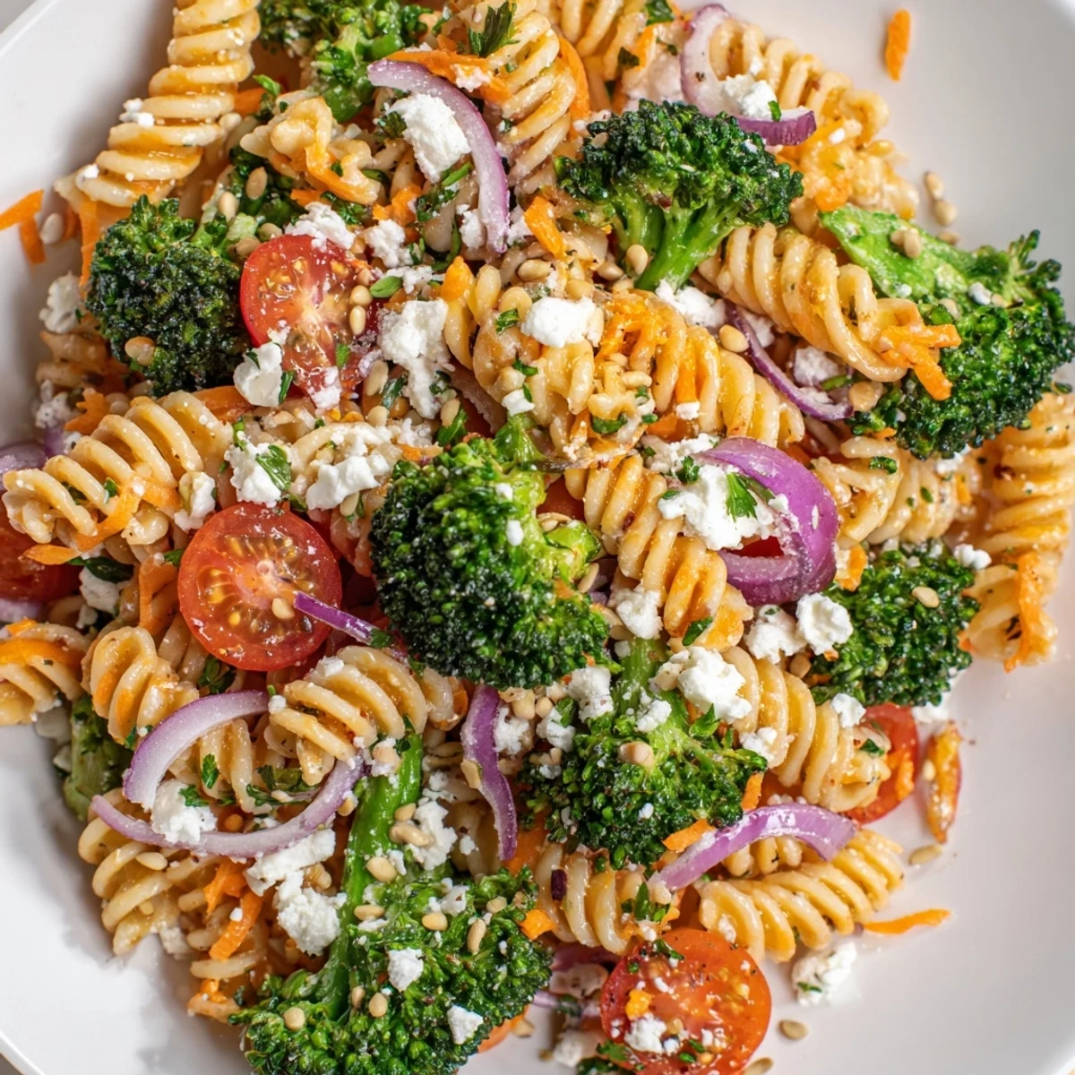 This bright and colorful dish combines tender pasta with crisp-tender broccoli florets, sweet cherry tomatoes, crunchy shredded carrots, and aromatic red onion. The zesty lemon-herb dressing brings everything together with notes of garlic, Dijon mustard, and premium olive oil.