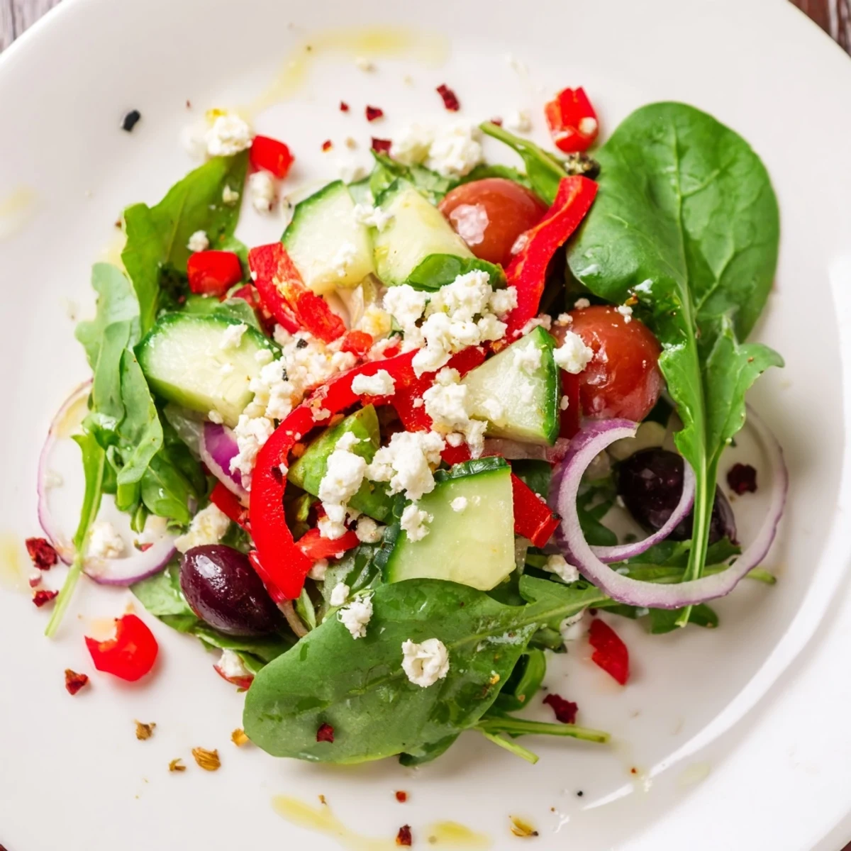 This vibrant, crisp salad brings together halved cherry tomatoes, diced cucumber and bell pepper, thinly sliced red onion and mixed greens. Optional feta or kalamata olives add briny depth. Whisk extra virgin olive oil with lemon juice, Dijon and honey until emulsified, then drizzle and toss gently to coat. Serve immediately for best texture; add grilled chicken or chickpeas for protein, or omit cheese for a dairy-free version.
