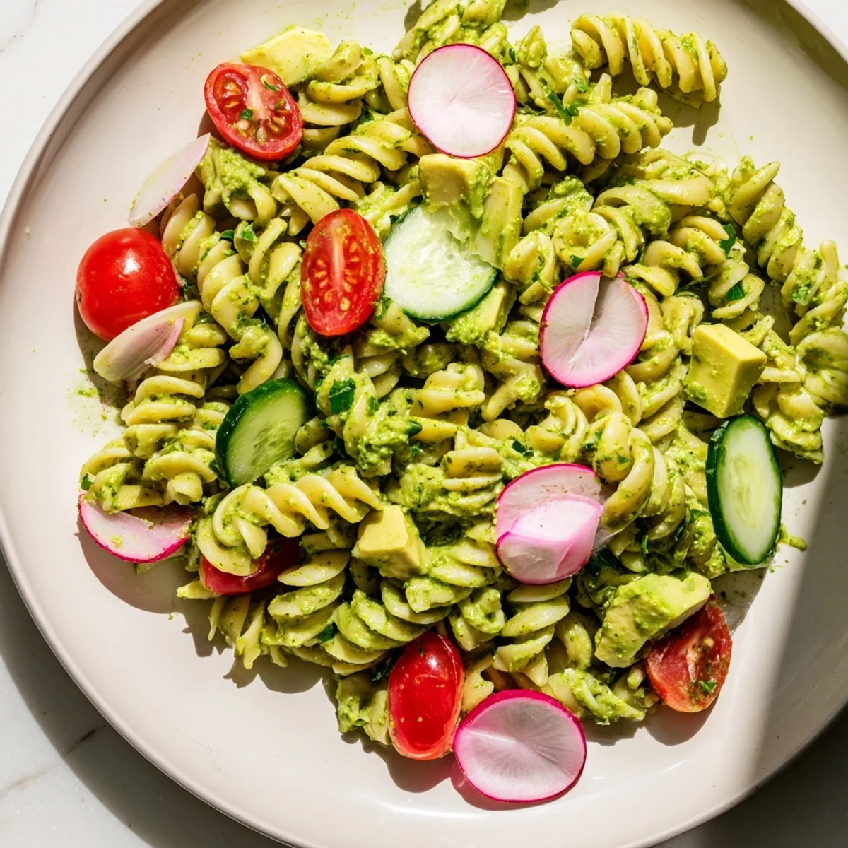 Short pasta shapes with nooks and crannies capture the creamy dressing beautifully. Fusilli, rotini, penne, or farfalle are excellent choices. The curves and ridges help hold the thick Green Goddess coating and mix well with chopped vegetables.
