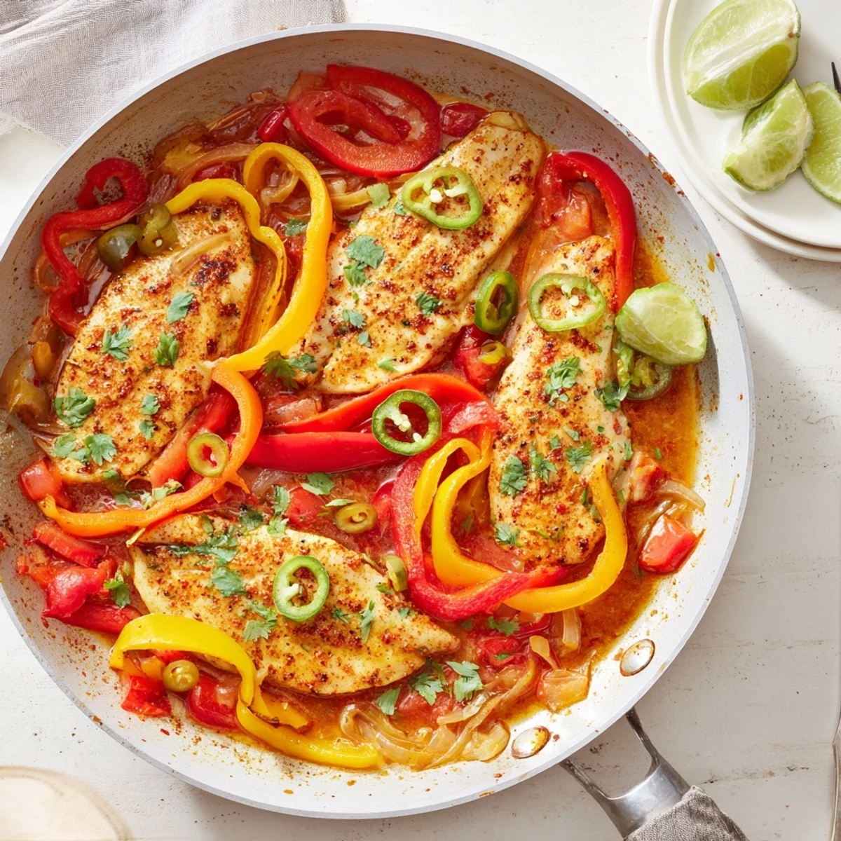 This vibrant skillet combines tender tilapia with a medley of roasted red and yellow peppers, jalapeño, and aromatic spices. The dish comes together in just 35 minutes, making it perfect for weeknight dinners when you want something special without spending hours in the kitchen. The fish is seared until golden, then nestled into a savory sauce of tomatoes, garlic, and spices that infuses every bite with bold flavor.