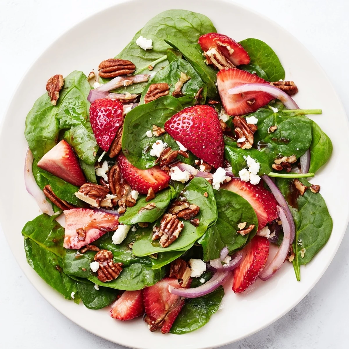 This vibrant salad combines fresh baby spinach with sweet sliced strawberries and toasted pecans, creating a perfect balance of textures and flavors. Thinly sliced red onion adds a mild bite, while an emulsified dressing of olive oil, balsamic vinegar, honey, and Dijon mustard brings a tangy sweetness that brightens the dish. Optionally topped with crumbled feta cheese, this salad is quick to prepare and suits vegetarian and gluten-free preferences. Ideal as a light meal or side, it pairs well with crisp white wines.