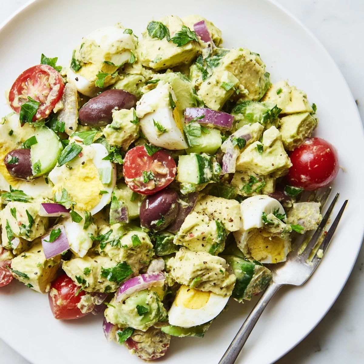 This Mediterranean-inspired egg salad combines hard-boiled eggs with creamy ripe avocado, crisp cherry tomatoes, cucumber, red onion, and briny Kalamata olives. A bright lemon-olive oil dressing with Dijon mustard, garlic, and oregano ties everything together. The result is a refreshing, protein-packed dish perfect for quick lunches, light dinners, or healthy snacking. Serve on toasted bread, in lettuce cups, or wrapped in pita for a complete meal.